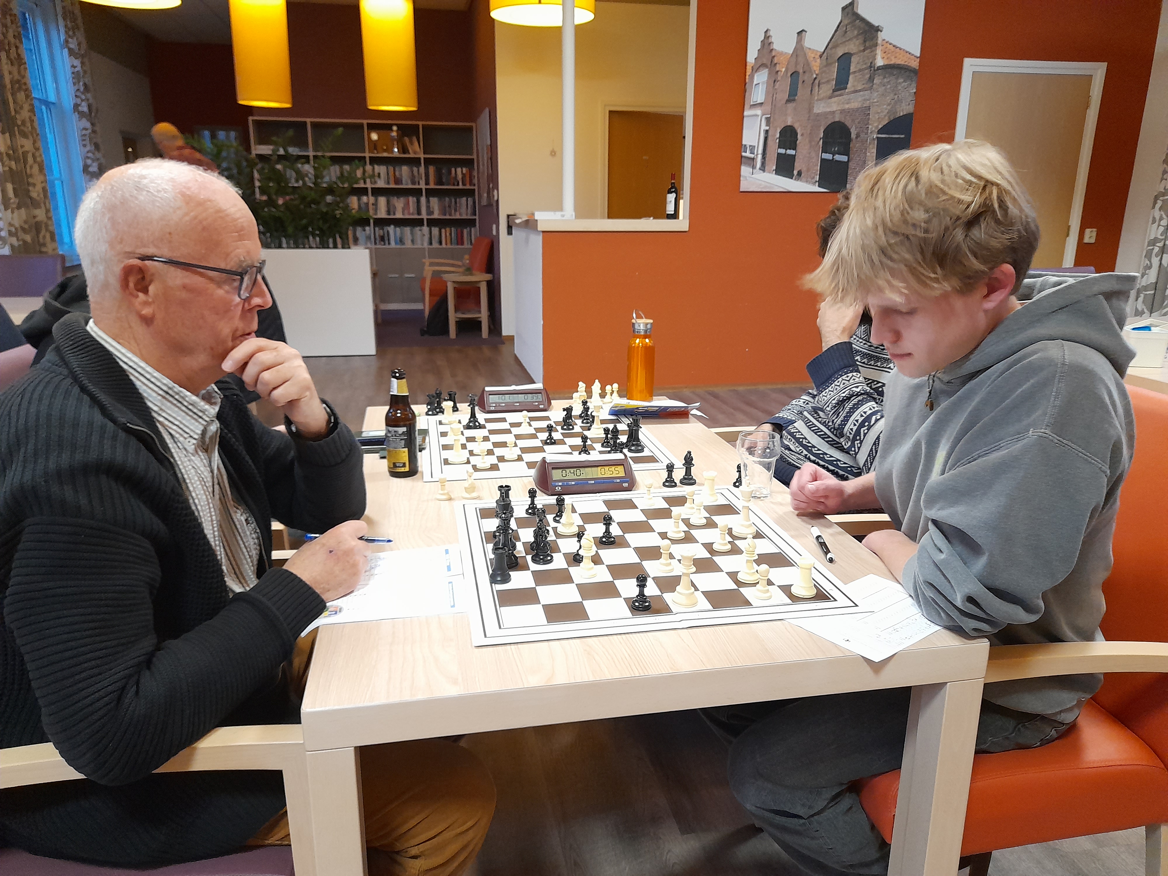 Toen de laatste van het bord dreigde te verdwijnen gaf hij op. Beide partijen waren het erover eens, het was een spannende partij geweest.
