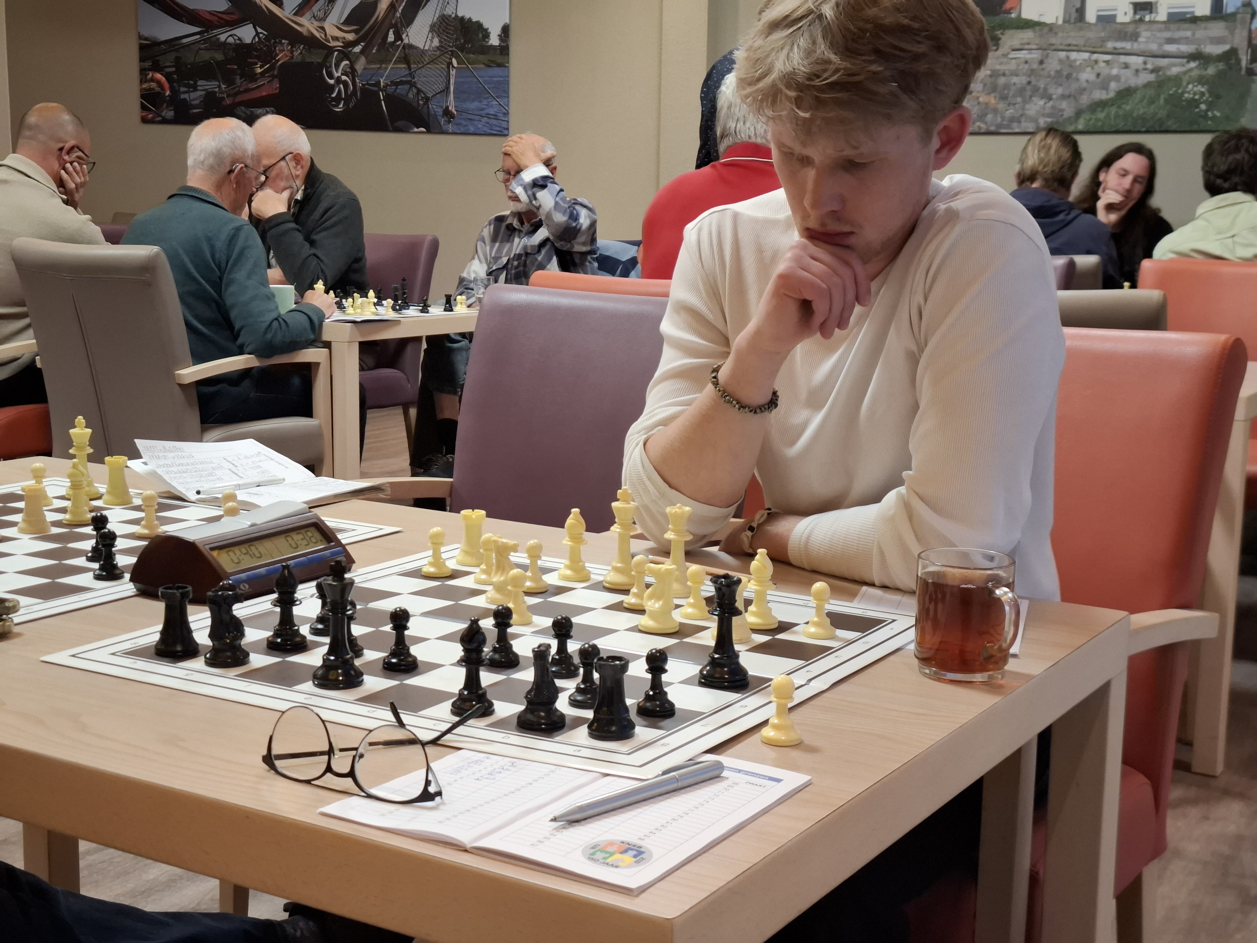 Beide spelers zagen er al weken naar uit de degens met elkaar te kruisen. Van de Beek met zwart, aanstormend naar het podium, speelt altijd zijn vertrouwde opening. Krijger, met wit, weet dit en kan zich erop voorbereiden. Wat Van de Beek zich ook weer realiseerde. Dus speelde hij met een iets andere variant waarop Krijger direct al moest gaan puzzelen. Dat lukte en zwart zette zijn loper op de zevende zet achteruit waarop wit zijn loper er tegenover zette om ze te ruilen. Maar zwart zette zijn paard, waarop wit stomverbaasd naar de stelling tuurde. En zich pas na een poosje realiseerde dat de loper van zwart ongedekt stond. Die ging eraf waarna zwart nog van alles uit de kast haalde maar uiteindelijk toch op de zevenenvijftigste zet mat ging. Beiden vonden het heel jammer dat de partij waar ze beiden hun zinnen op gezet hadden door een blackout beslecht werd.