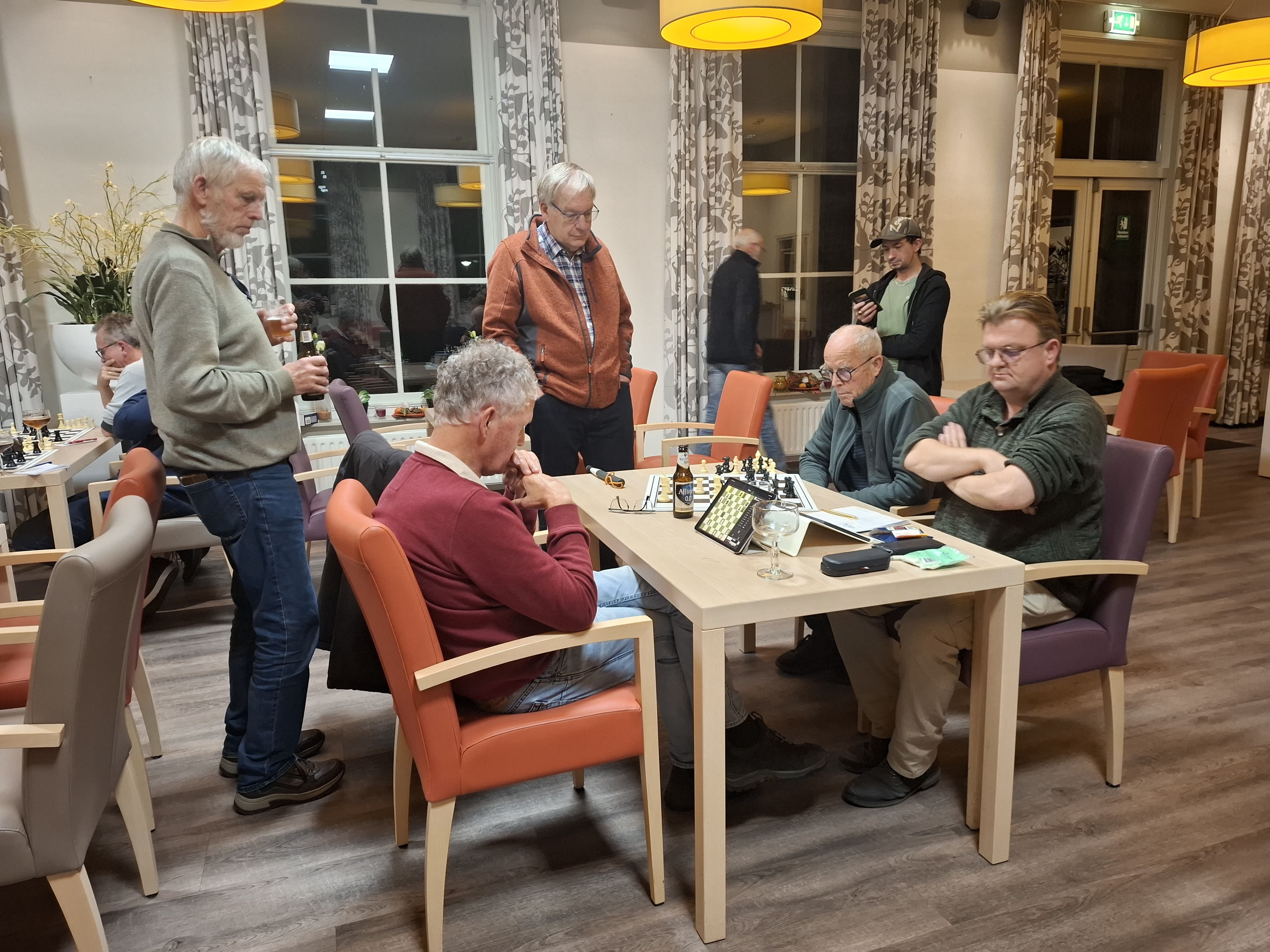 De Vrieze trof deze maandag Vieveen met zwart tegenover zich. Deze liet een flinke dreiging in het centrum toe waardoor hij verplicht paarden moest gaan ruilen. Later raakte hij een stuk achter tegen twee pionnen. Hij verdedigde kranig en de Vrieze had er een stevige kluif aan, maar wist uiteindelijk met een dreigende promotie van de a-pion de partij na een blunder van Vieveen winnend af te sluiten. Beiden waren het erover eens dat ze beiden sterke posities hadden gehad met kansen voor beiden. De analyse moet uit laten komen waar het fout ging, want deze heren hadden na de partij eigenlijk geen idee waar de foute zetten zaten.