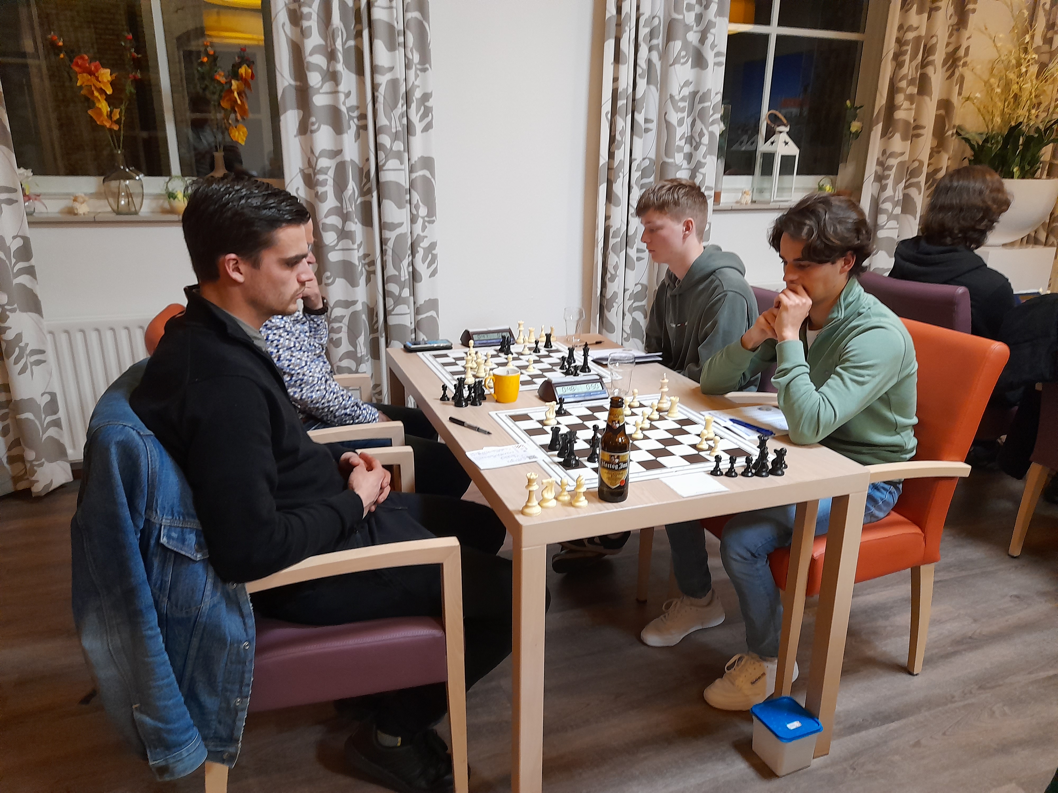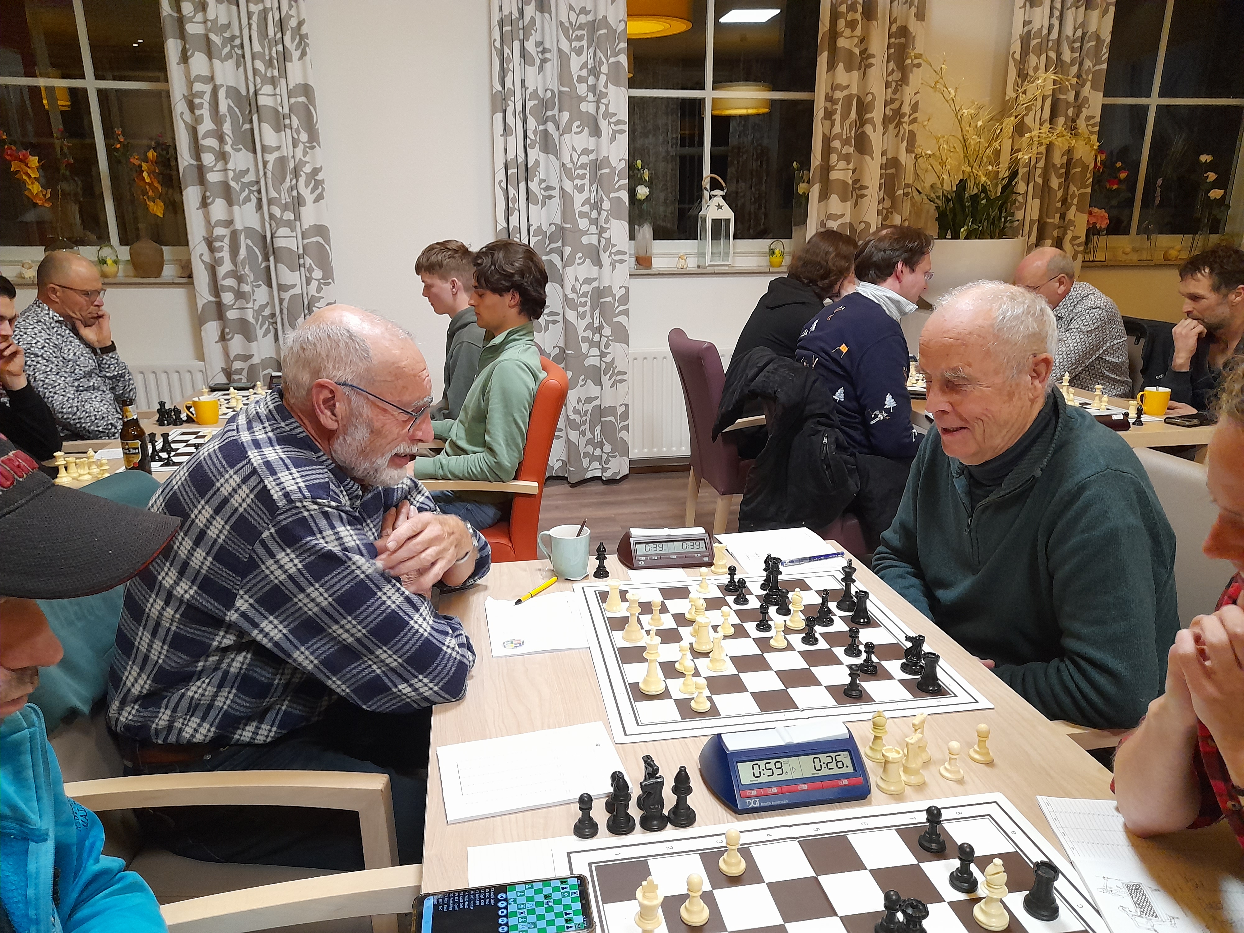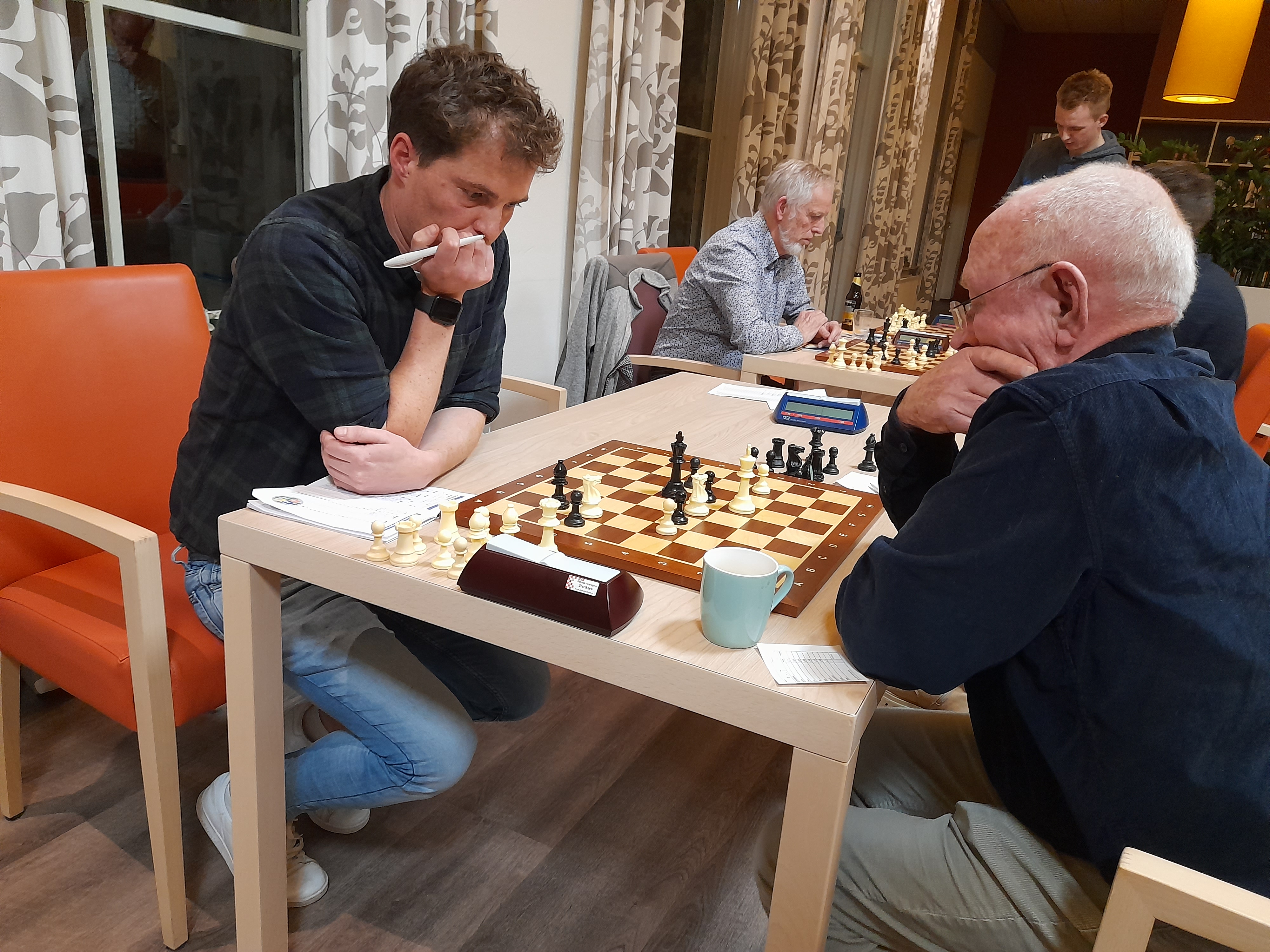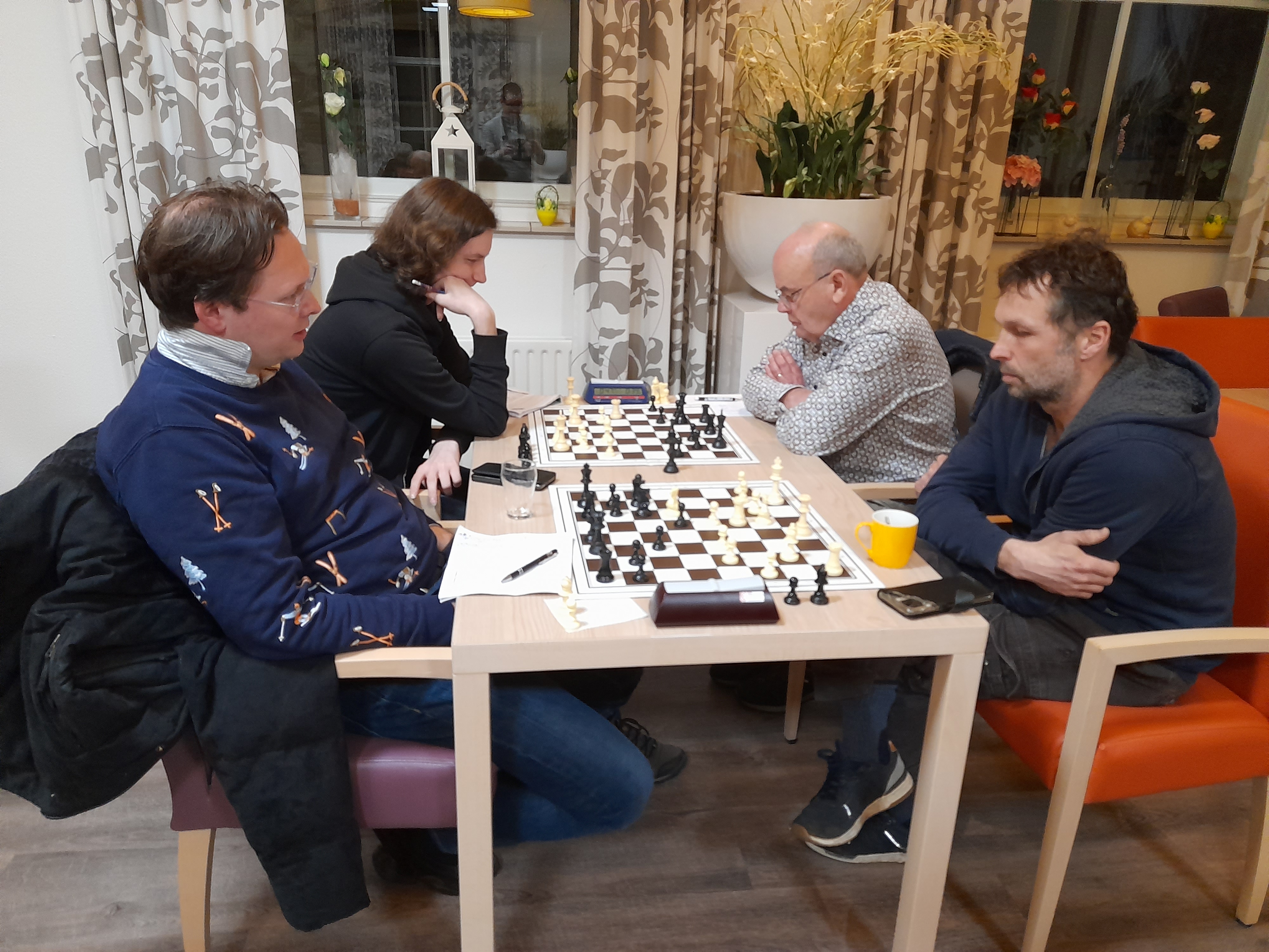 Op het tweede bord wist Aloys Kersten in het middenspel zijn tegenstander goed onder druk te zetten en kwam in een gewonnen eindspel. Dit wist hij bekwaam uit te spelen en bracht de stand weer in evenwicht. Peter de Vrieze speelde een gedegen partij waar alles een beetje vast kwam te staan. Geen van beide spelers zag kans om een doorbraak te forceren en er werd tot remise besloten. Op het eerste bord speelde Sjaak Spiegels een moeilijke partij. Zijn tegenstander ging gelijk voor een koningsaanval. Om tegenspel te creëerde probeerde Spiegels een opening te maken in het centrum waar de koning van zijn tegenstander nog stond. Dit lukt niet helemaal en zijn tegenstander ging weer in de aanval.