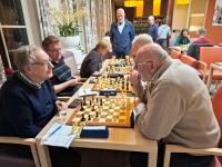 Paul Greefhorst (links) was er juist even voor gaan staan, want hij moest eens grondig nadenken. Het bleek niet eens meer nodig, want plots pakte Fokko Baakman (rechts) te snel een pion vast. Het was al weer twee jaar geleden dat op deze manier een partij abrupt ten einde kwam. Want Baakman's dame zou namelijk van het bord verdwijnen. Het bleek overigens niet het enige bord waar soms te snel werd gespeeld.