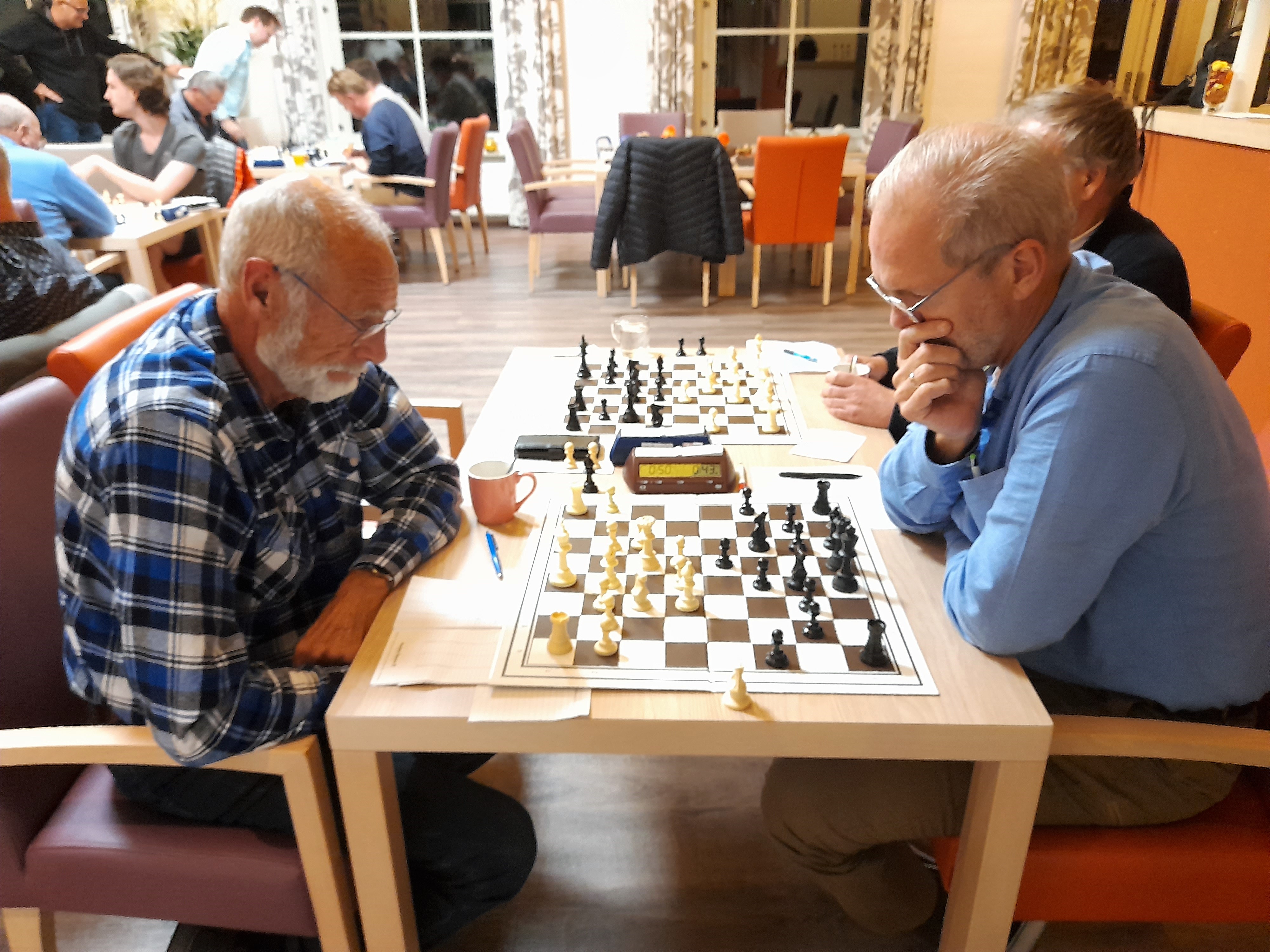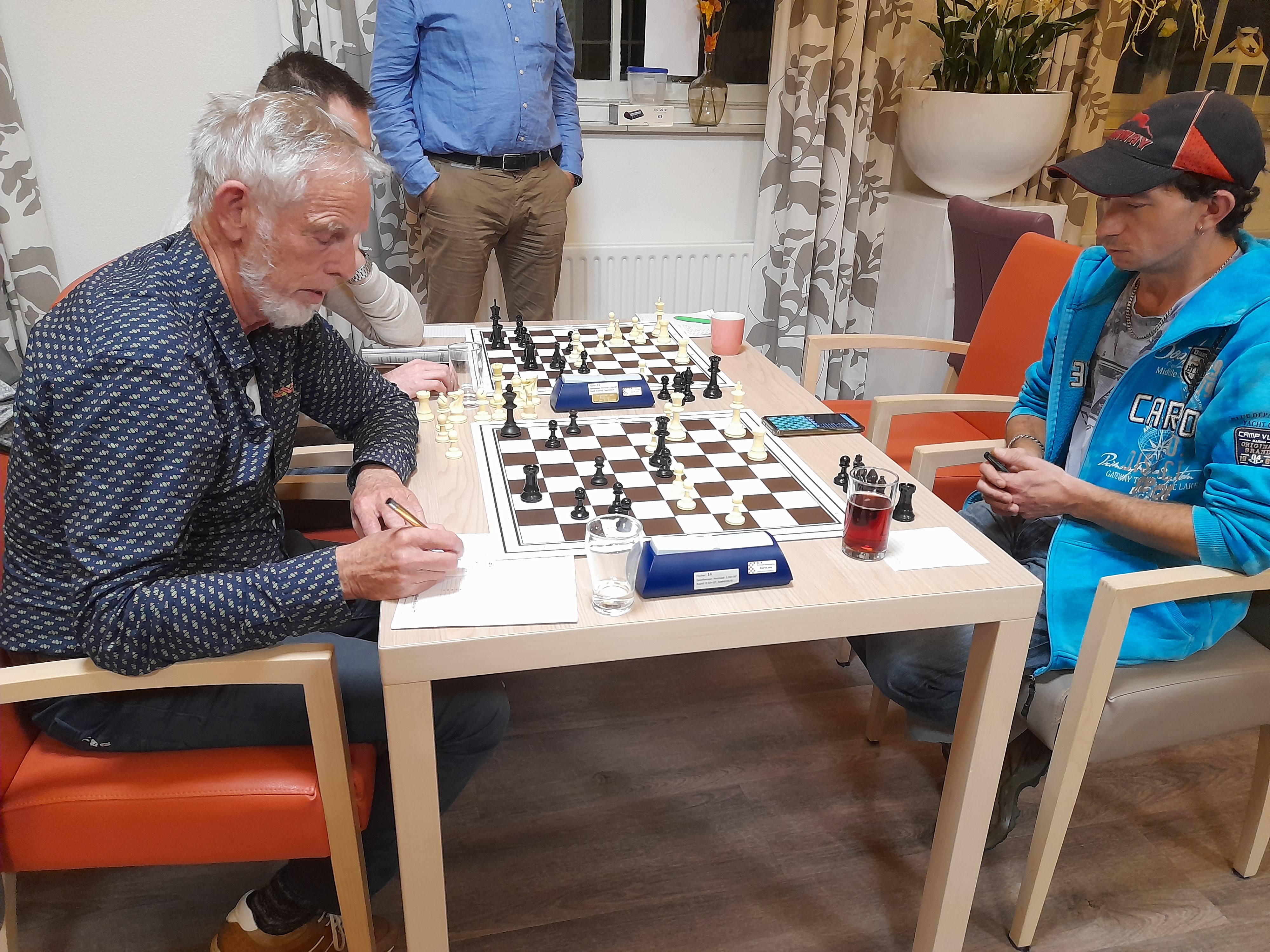 ,,Het kan verkeren....!” Na een interessante openingsfase zette Jansen de zwarte stelling van Vieveen op slot en toen zwart ook nog kort rokeerde zag het er even somber voor hem uit. Een vernietigende aanval op de zwarte koningsstelling dreigde. Echter, wit ruilde totaal verkeerd af! De witte paarden verdwenen en zwart verkreeg de overhand met een loper meer. Een vernietigende aanval werd ingezet.