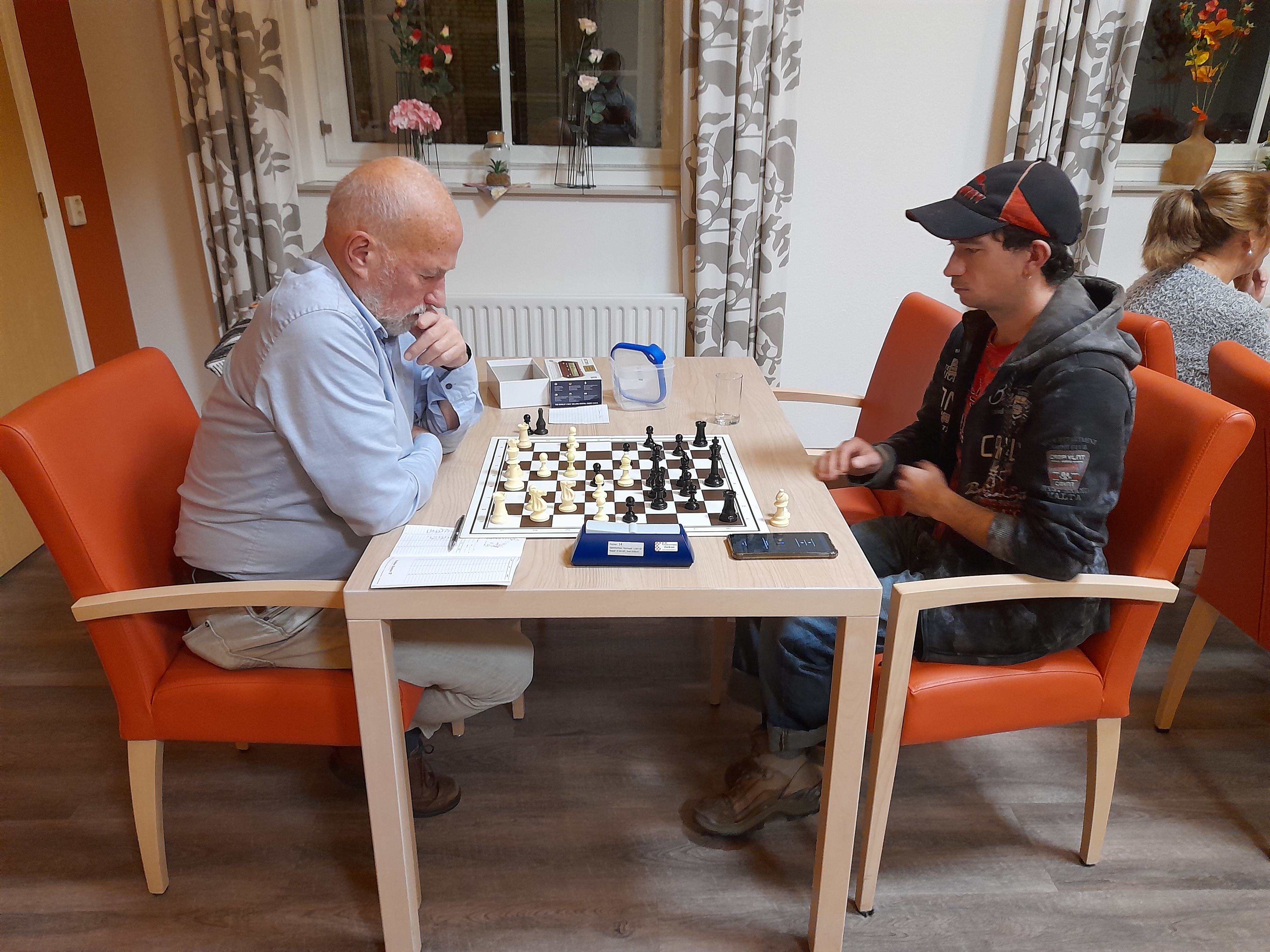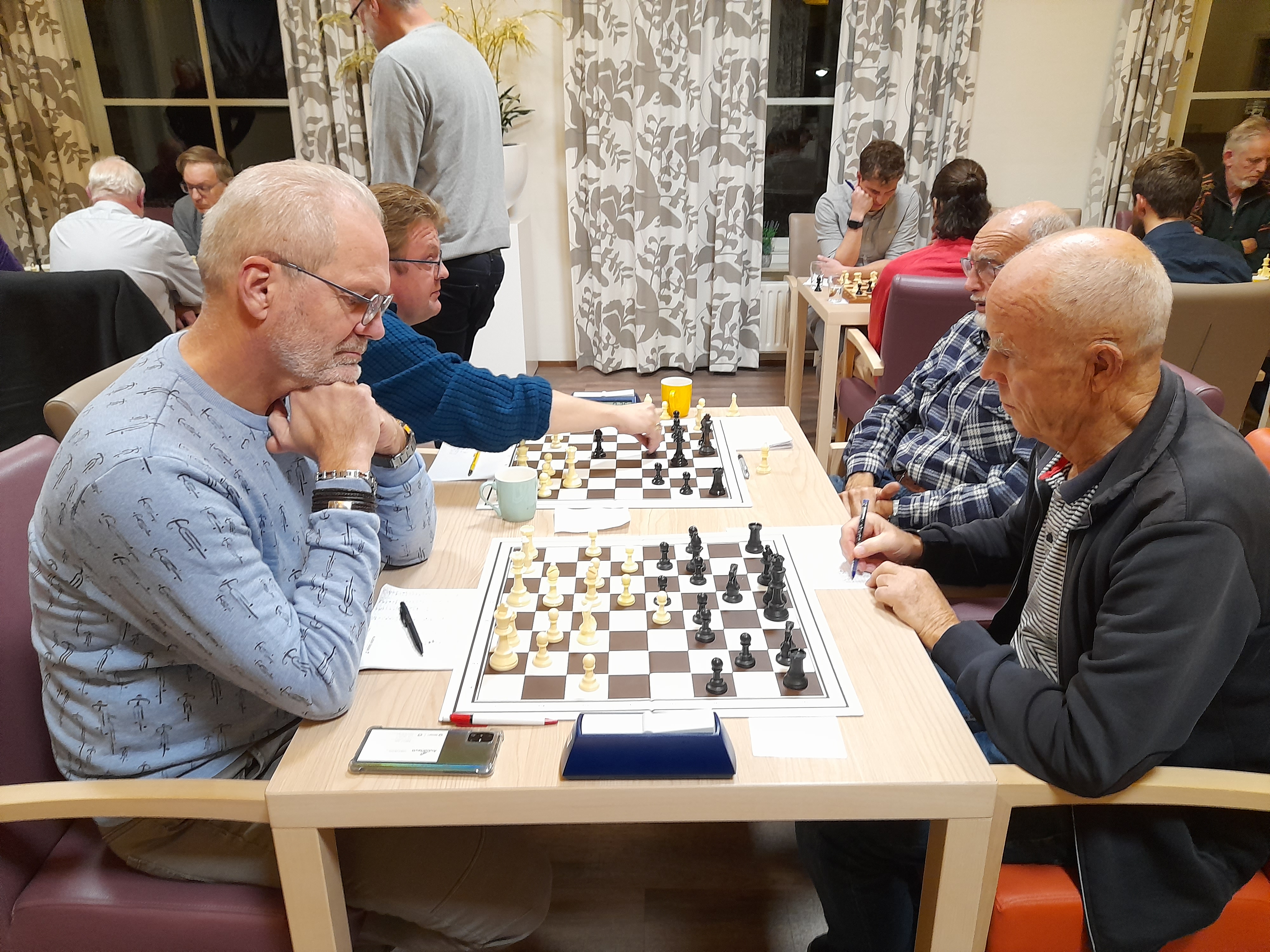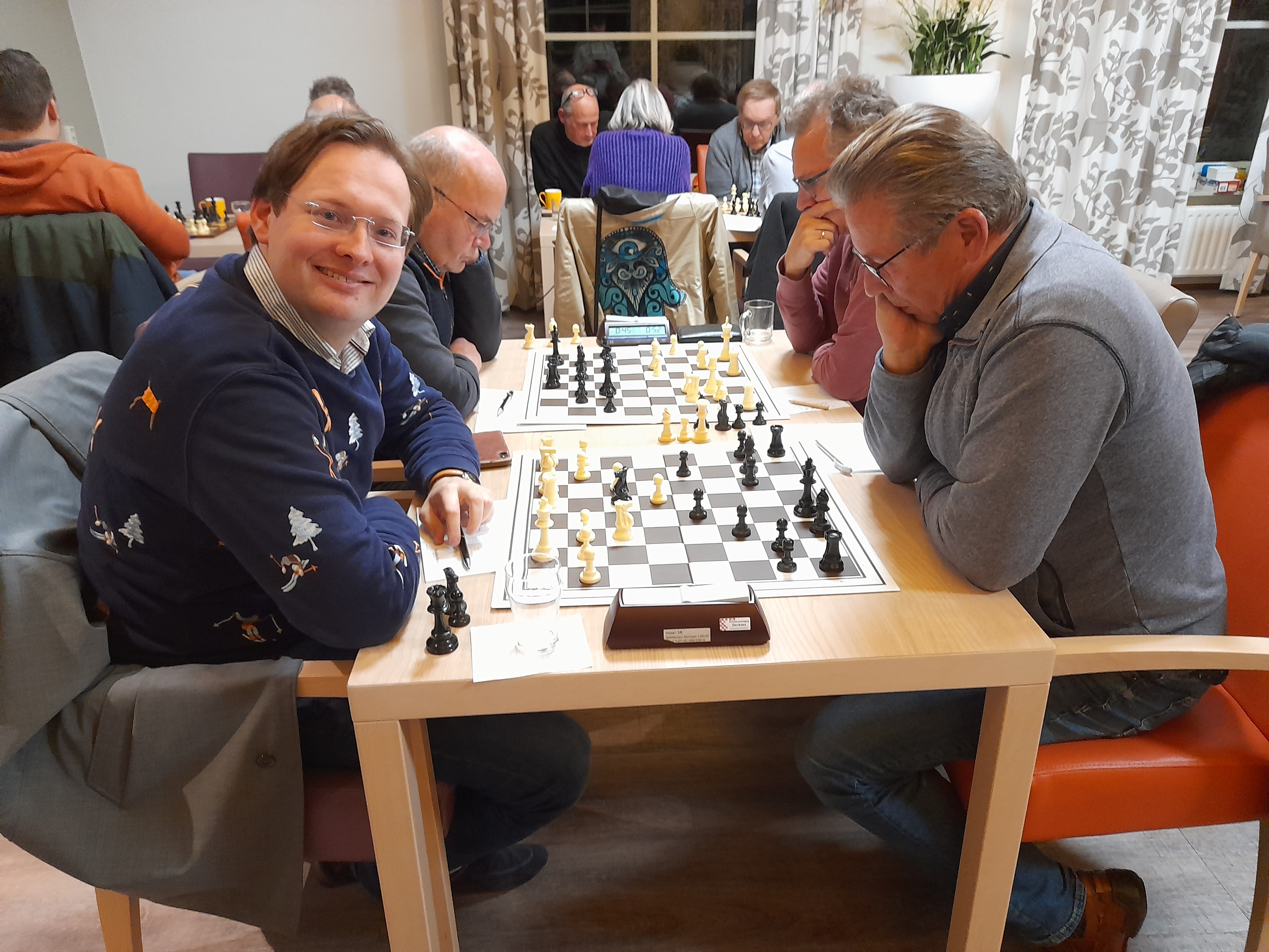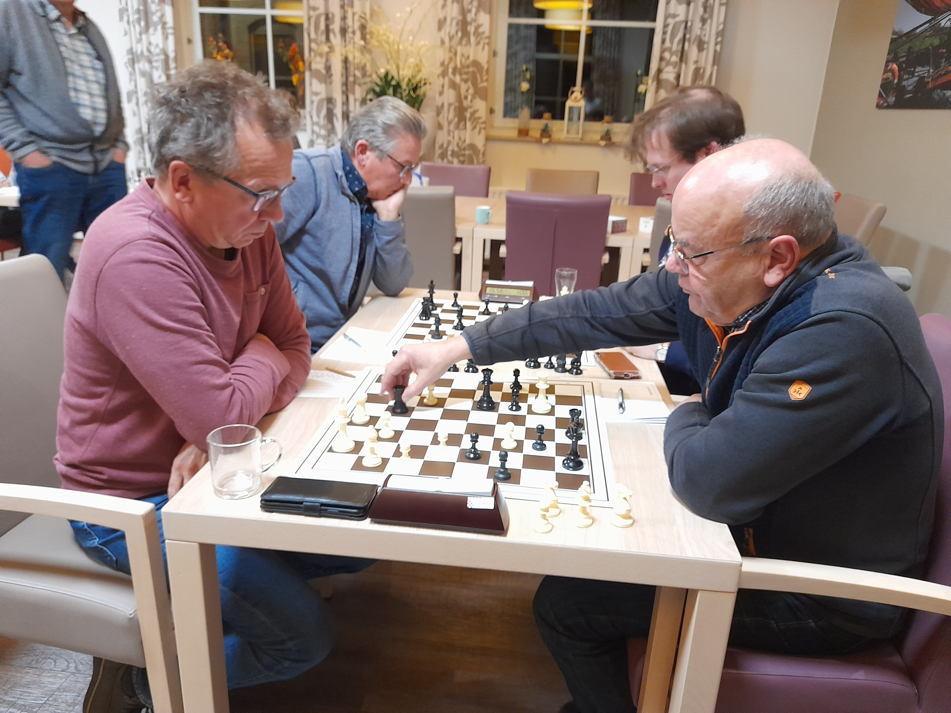 Er waren deze speelavond al partijen afgerond op het moment dat alle vier de partijen van deze externe wedstrijd nog bezig waren. Maar het B-team beleefde vooral op de borden twee en drie een lastige avond. Op bord één was Paul Greefhorst als eerste klaar met een remise tegen Matthijs Schouten. Greefhorst stond op het punt te verliezen door een kwaliteit en een pion achterstand, toen zijn tegenstander in een paardvork liep en zijn toren zou verliezen.