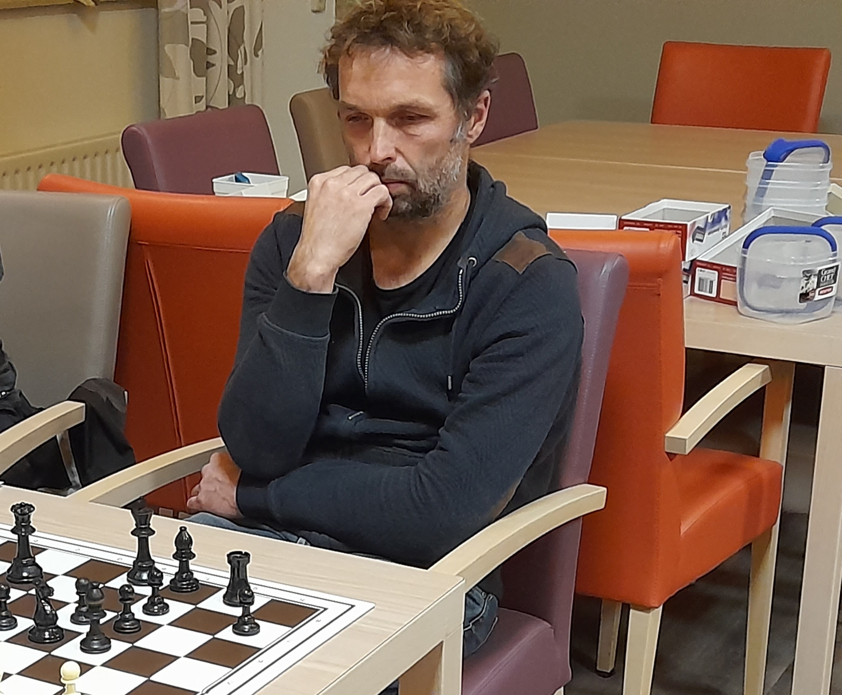 Martin Krijger was ’s ochtend teruggekomen van vakantie en had niet veel geslapen. En dat was bij latere analyse dan ook goed te merken. Krijger kwam met wit goed uit de opening tegen ons oud-lid Eric Bouman en bouwde een flink ontwikkelingsvoordeel op.