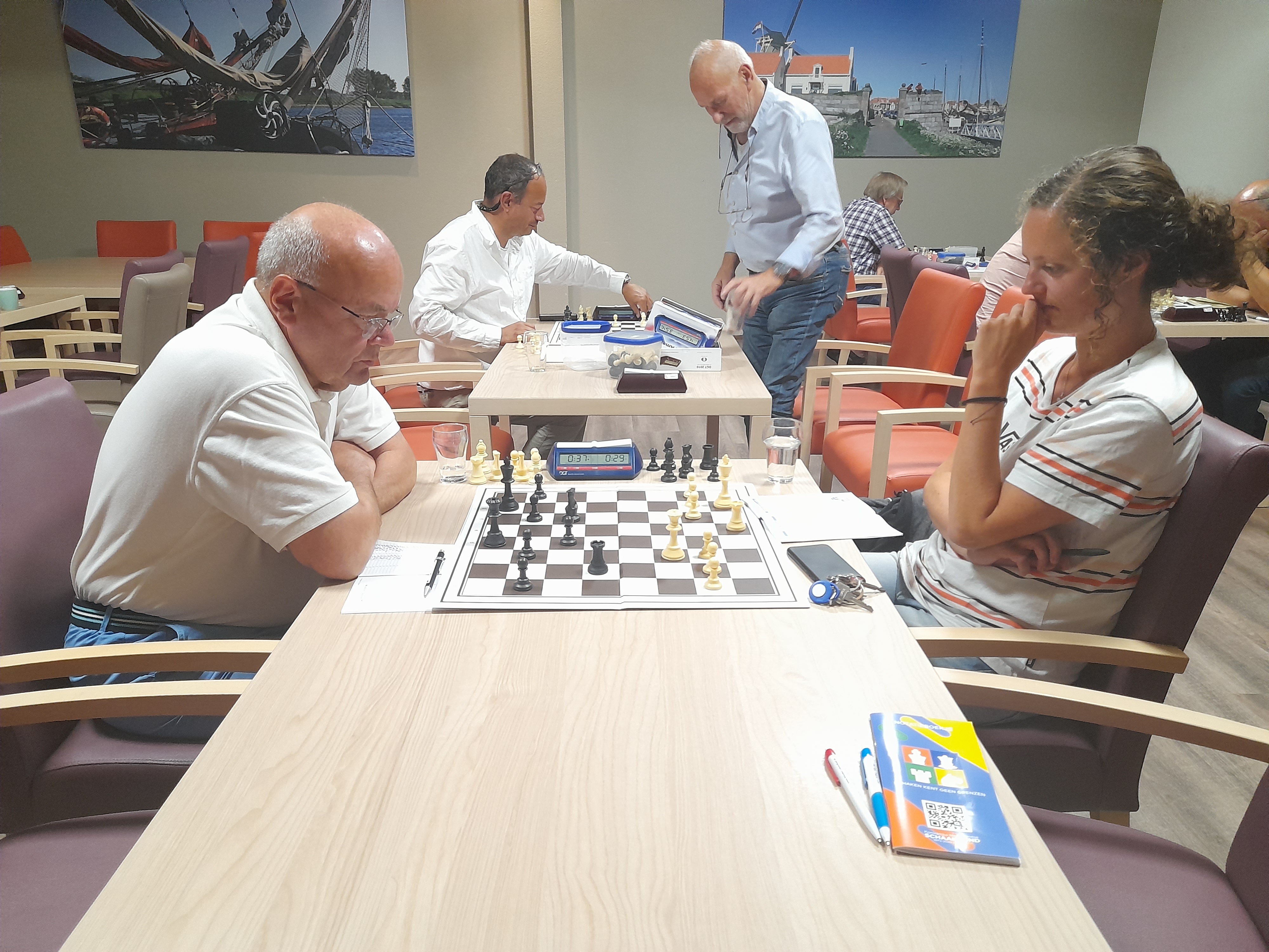 Deze keer duurde het wat langer. Blinde stond er goed voor, maar door een blunder gaf ze de partij uit handen. Door een toren één veld op te schuiven werd Donkers de kans geboden via schaakmat de partij te winnen.