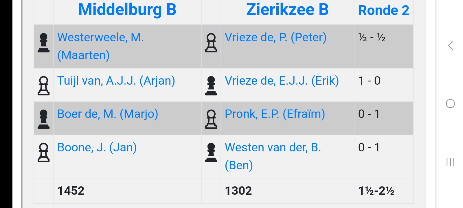 | Competitie | Ronde | Wit | Zwart | Uitslag |
