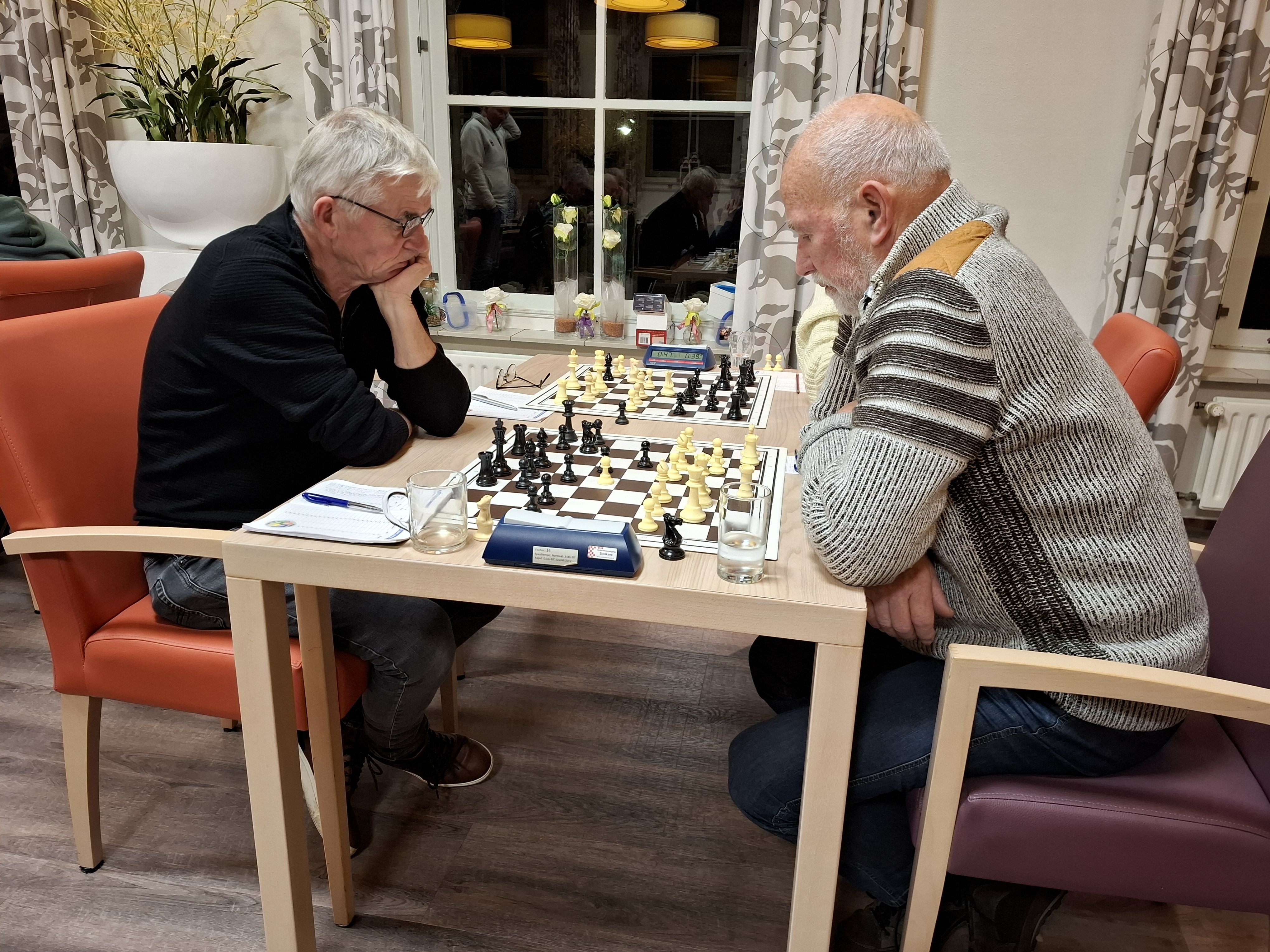 Hij won een pion en de koning van Krijger kwam “op de tocht” te staan. De stelling was knap ingewikkeld en Spiegels vond niet altijd de beste voortzetting. Na dameruil ging Krijger met zijn koning naar voren om zijn vrijpion te ondersteunen. Spiegels, die intussen zijn bedenktijd zag slinken, stuurde aan op zetherhaling waarna de strijdbijl werd begraven.