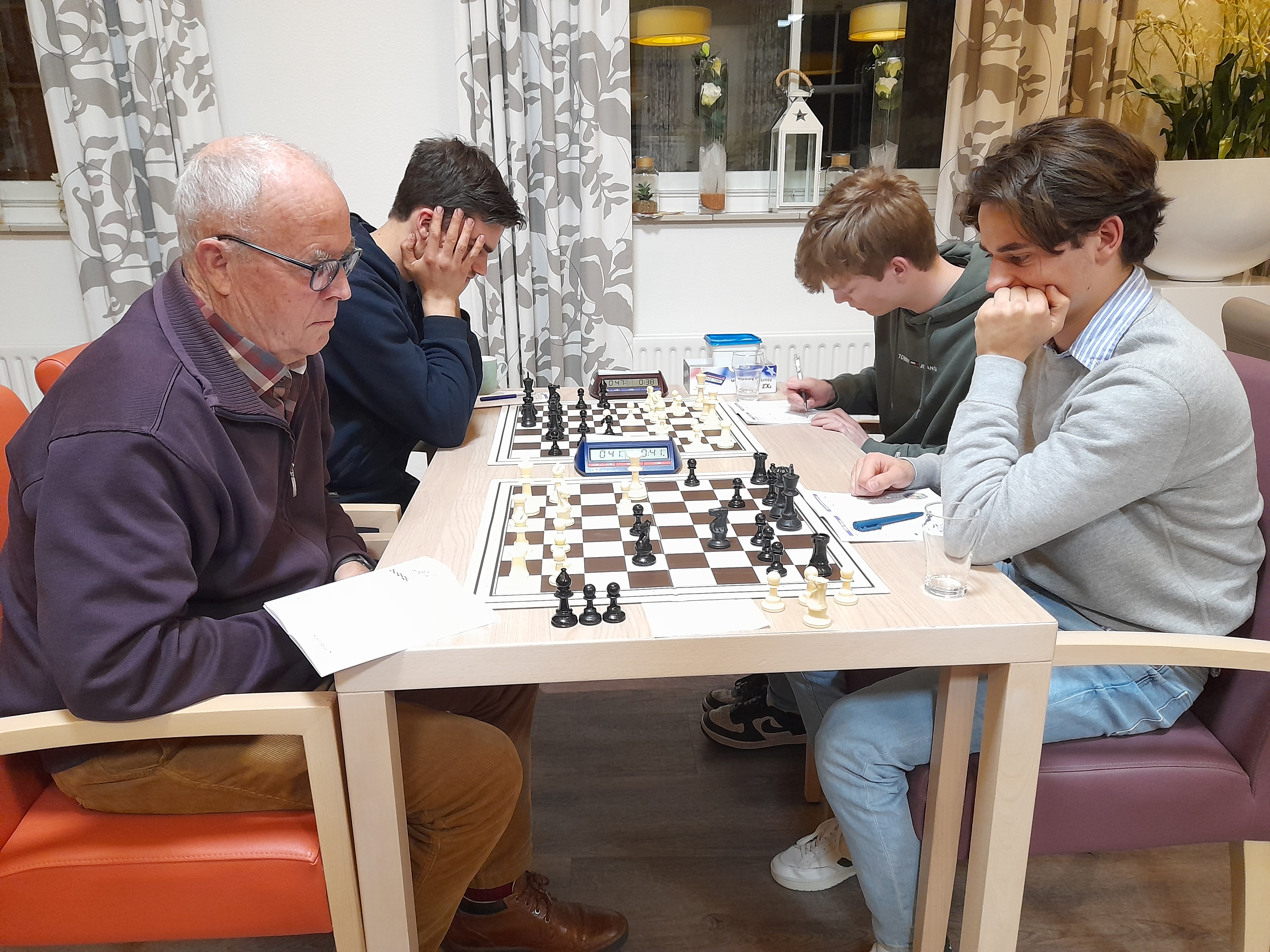 Dit zette de witte koning wel heel erg buitenspel, drie pionnen voor zwart tegen twee, met de zwarte koning het dichtst bij. De witte overgave volgde, en zo won zoon De Vrieze voor het eerst in zeven seizoenen voor de tweede maal van zijn vader in een seizoen.