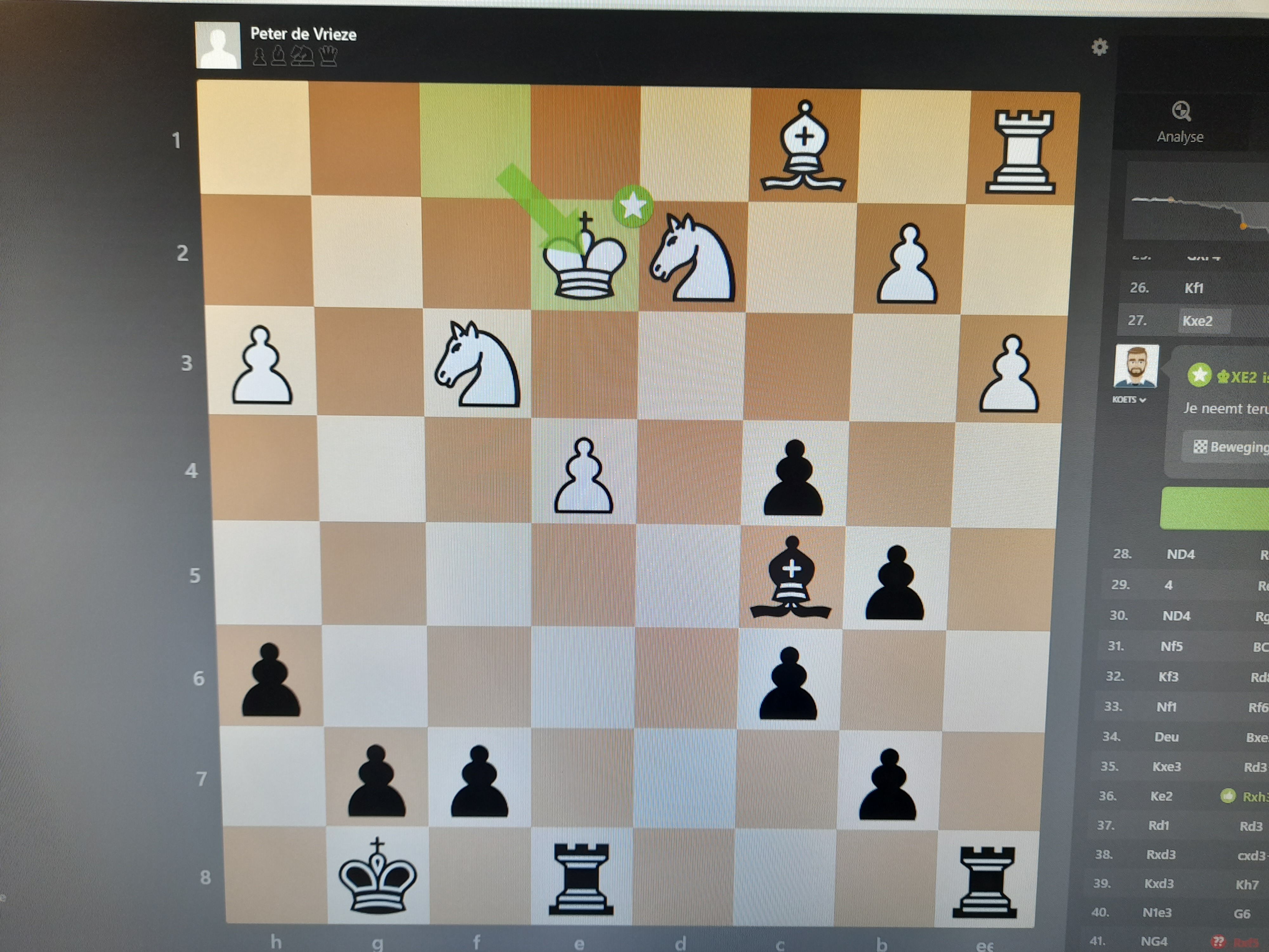 Uiteindelijk ruilde zwart zijn laatste toren tegen een paard (chess.com beoordeelde dit als een blunder) en was het eindspel koning, paard en twee pionnen namens wit tegen een koning en zes pionnen namens zwart. Zwart was met een pion op de drempel van promotie (h2) zijn met zijn paard wanhopig schaak gevende vader met twee slimme koningszetten te slim af. Wit kon de zwarte pion op h2 alleen slaan door zijn paard weg te geven.