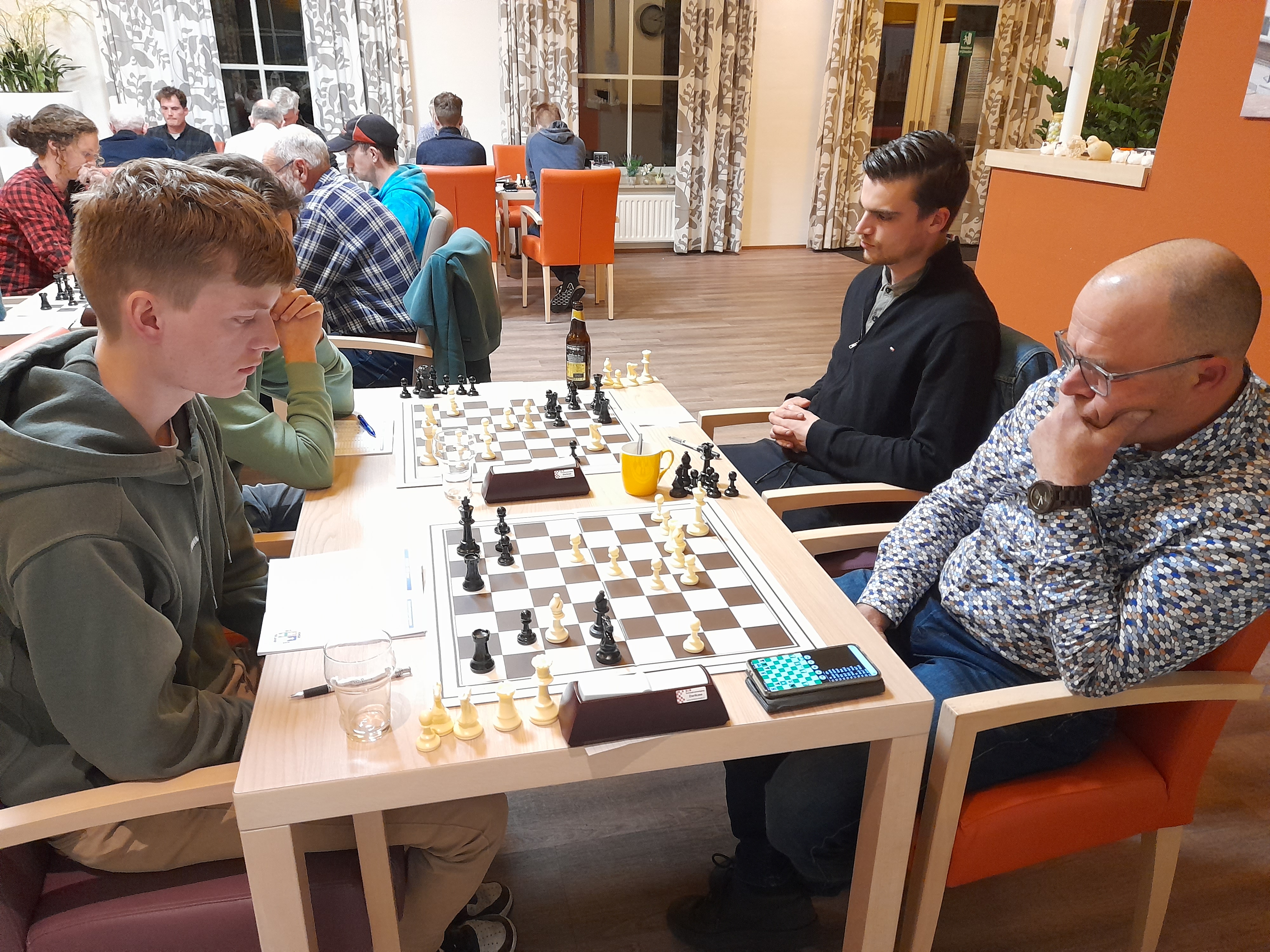 Op het tweede bord wist Aloys Kersten in het middenspel zijn tegenstander goed onder druk te zetten en kwam in een gewonnen eindspel. Dit wist hij bekwaam uit te spelen en bracht de stand weer in evenwicht. Peter de Vrieze speelde een gedegen partij waar alles een beetje vast kwam te staan. Geen van beide spelers zag kans om een doorbraak te forceren en er werd tot remise besloten. Op het eerste bord speelde Sjaak Spiegels een moeilijke partij. Zijn tegenstander ging gelijk voor een koningsaanval. Om tegenspel te creëerde probeerde Spiegels een opening te maken in het centrum waar de koning van zijn tegenstander nog stond. Dit lukt niet helemaal en zijn tegenstander ging weer in de aanval.