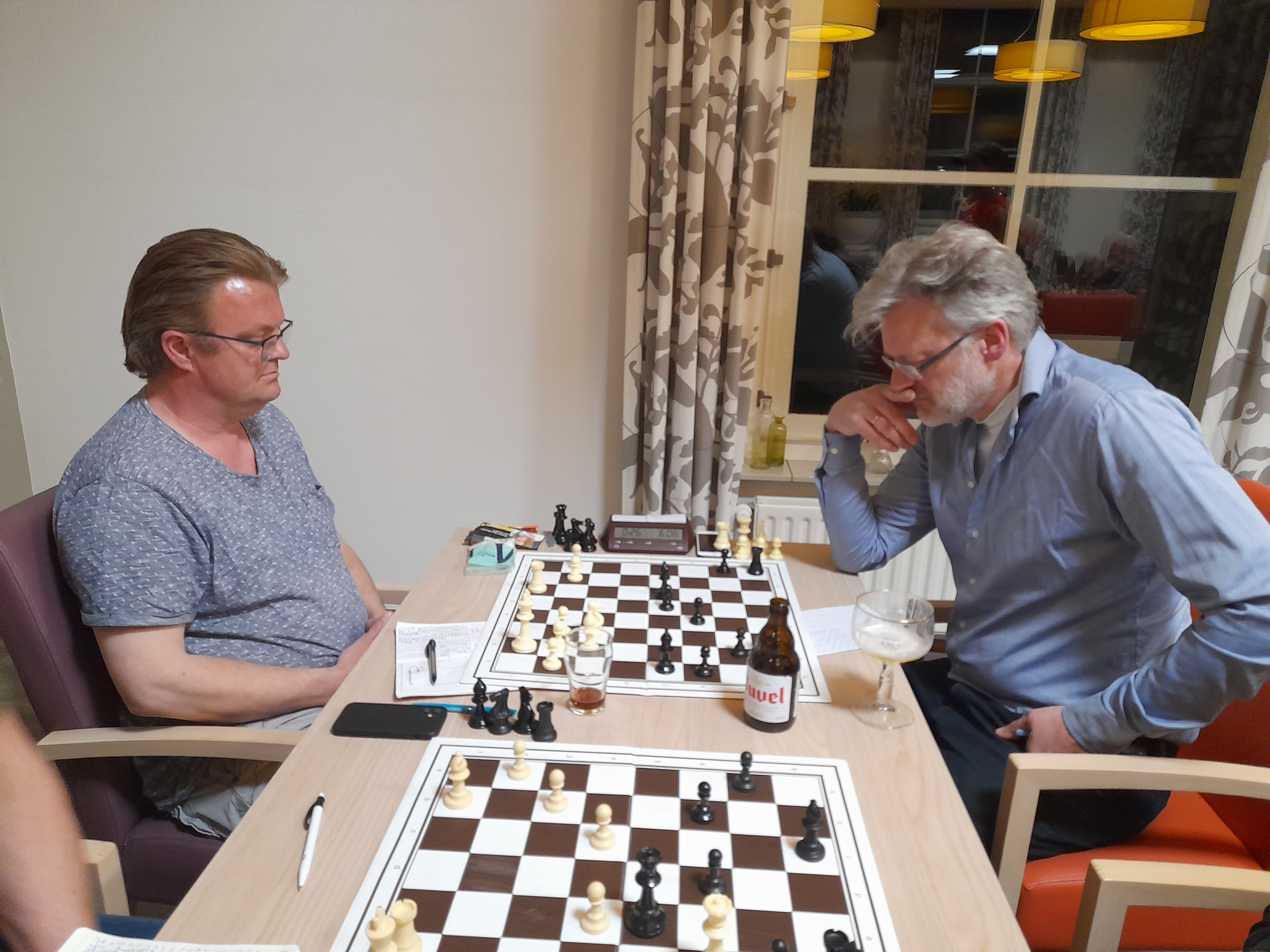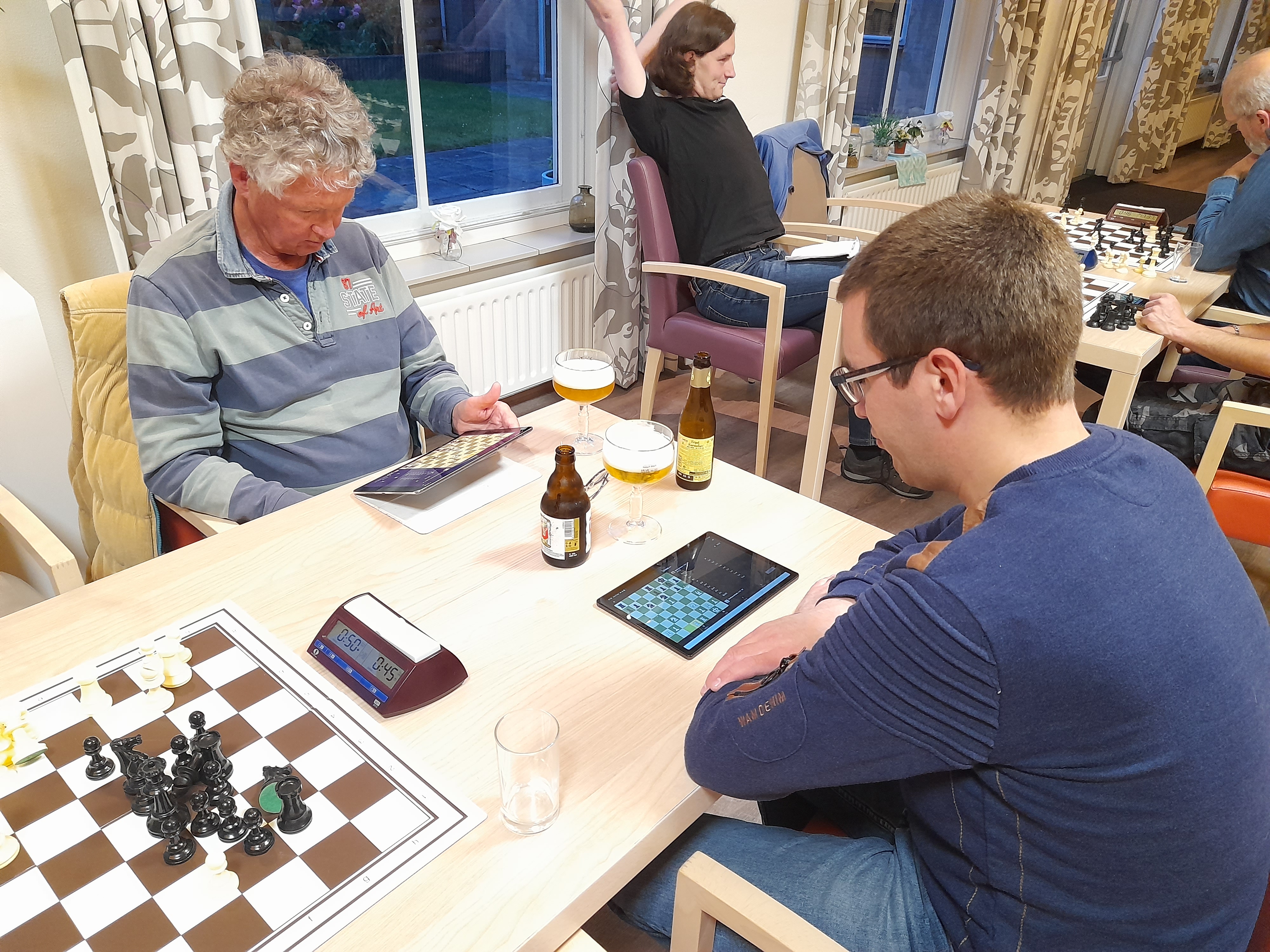 De stukken vlogen over en weer van het bord. Het mag een wonder heten dat wit nog pionnen buit wist te maken en uiteindelijk een remise aanbod kreeg van Paul. Pieter-Jan zag geen uitweg meer (die was er ook niet) en accepteerde het aanbod.