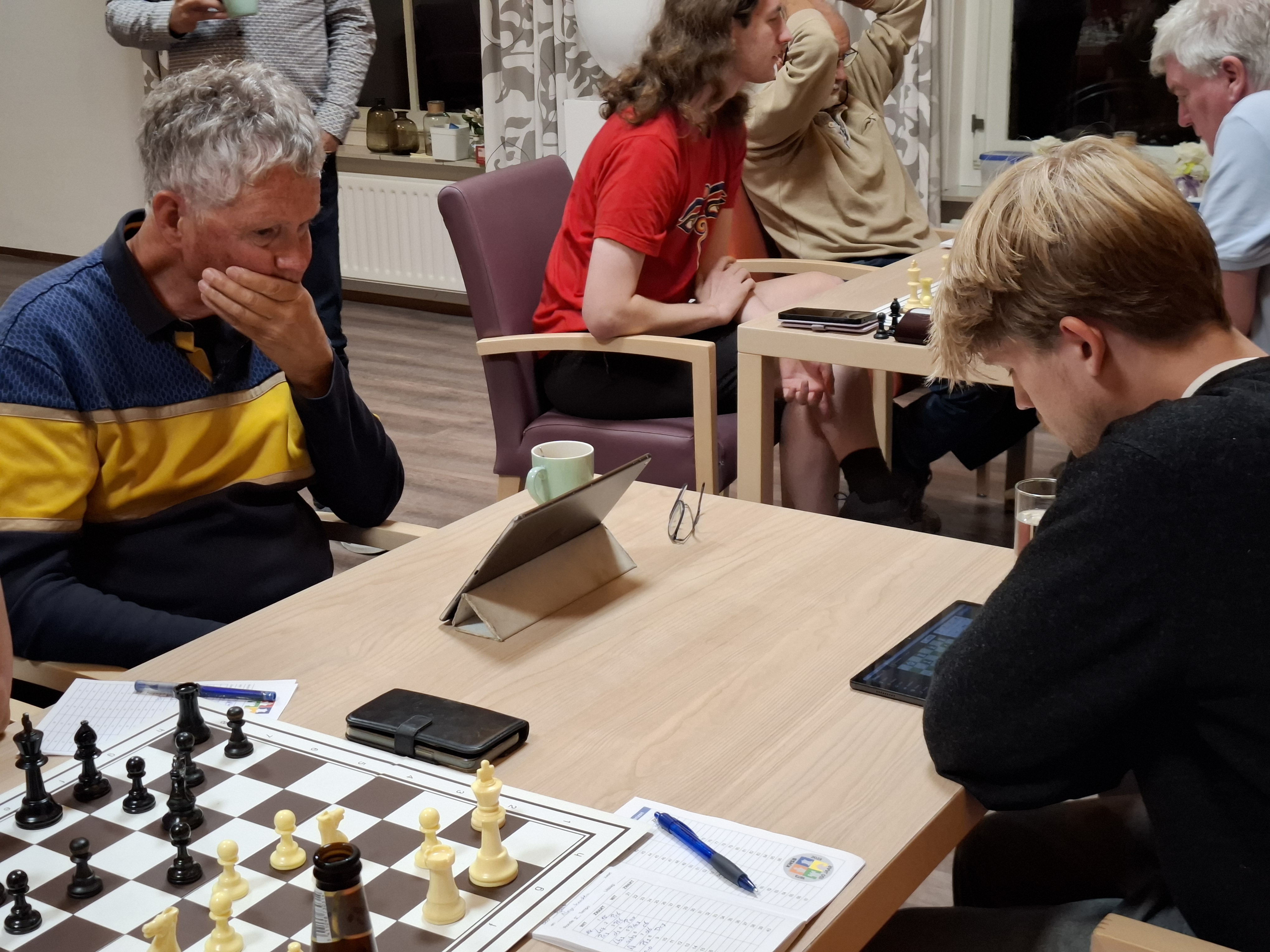 Beide spelers wisten niet, wanneer ze voor het laatst tegen elkaar gespeeld hadden. Dit blijkt in speelronde drie van het seizoen 2022/2023 te zijn geweest. Toen won Weeland, met de zwarte stukken. En voor de volledigheid: beiden speelden zeven keer eerder tegen elkaar, waarbij Weeland vier keer won en het drie keer in remise eindigde. Wel konden ze zich de partijen met de vreemdste openingen en verloop herinneren. Altijd leuk. Weeland nam na de opening het initiatief en slaagde erin dit initiatief de gehele partij te behouden.