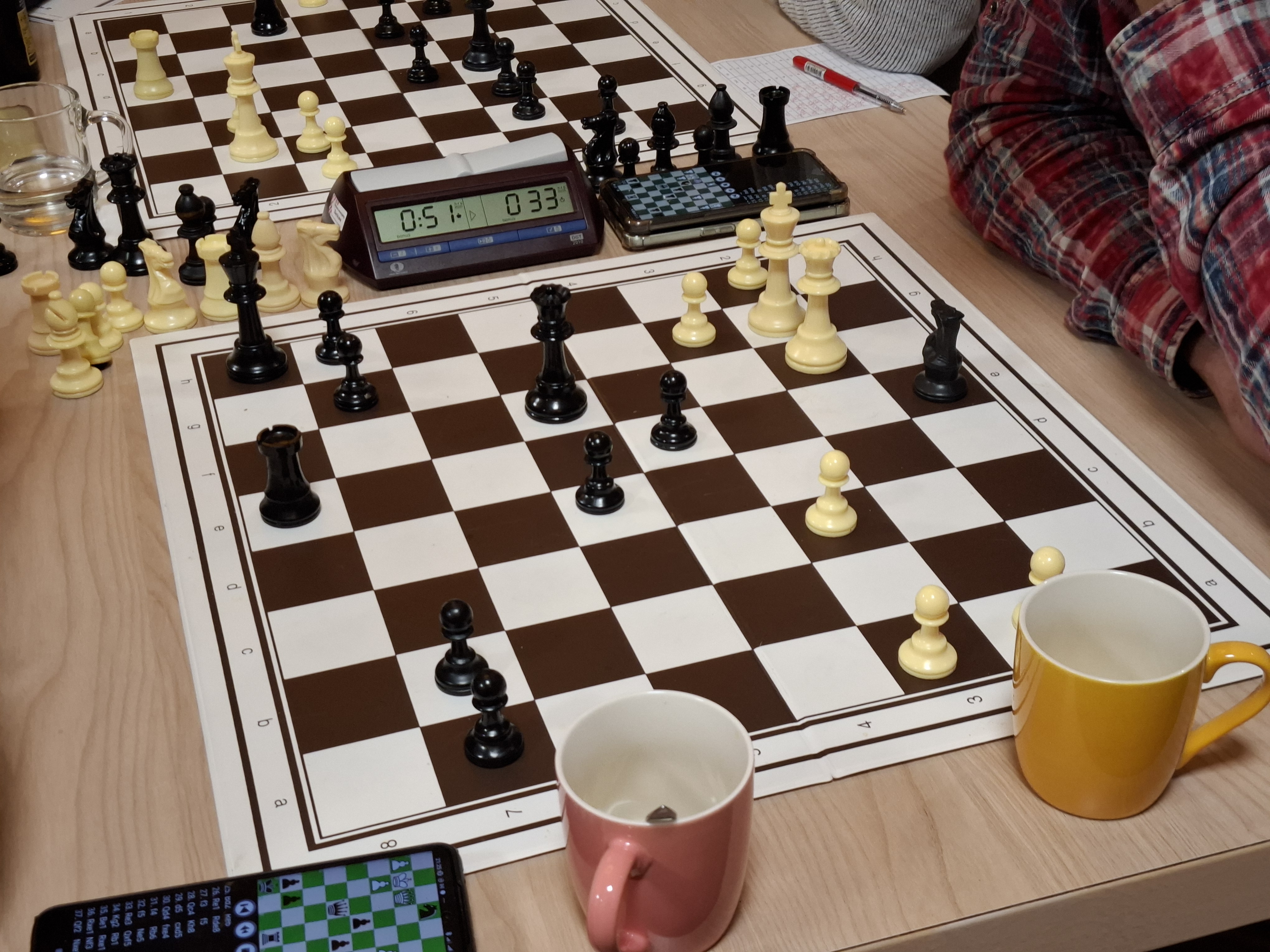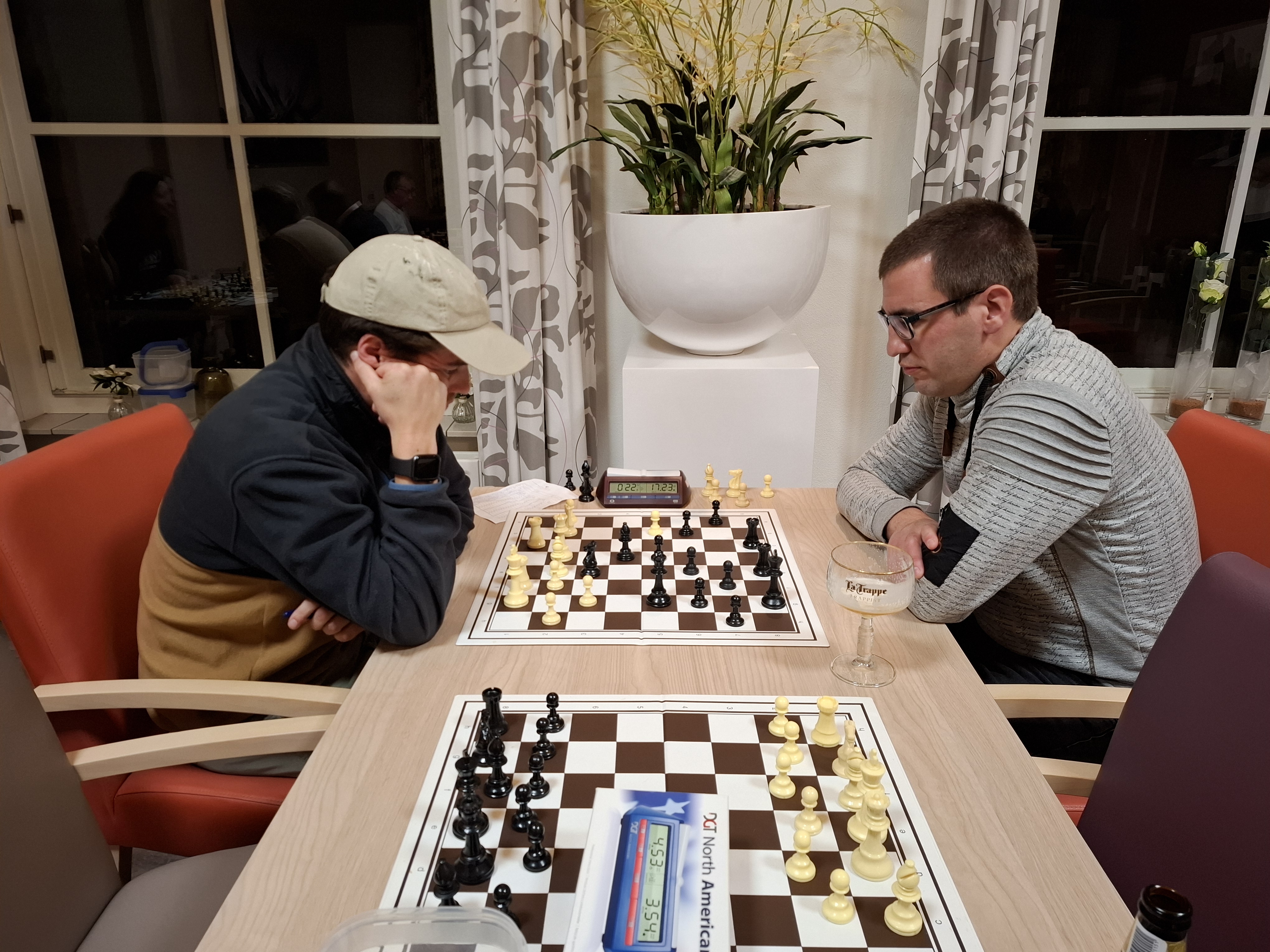 Tien zetten later kon De Vrieze op twee en zelfs drie pionnen voorsprong komen waarna het eindspel met alleen de pionnen op het bord rustig uitgeschoven kon worden door De Vrieze met mat van de witte koning door de gepromoveerde zwarte dame. Beide spelers hadden, ook dankzij dertig seconden per zet erbij, elk nog vijfenvijftig minuten bedenktijd!
