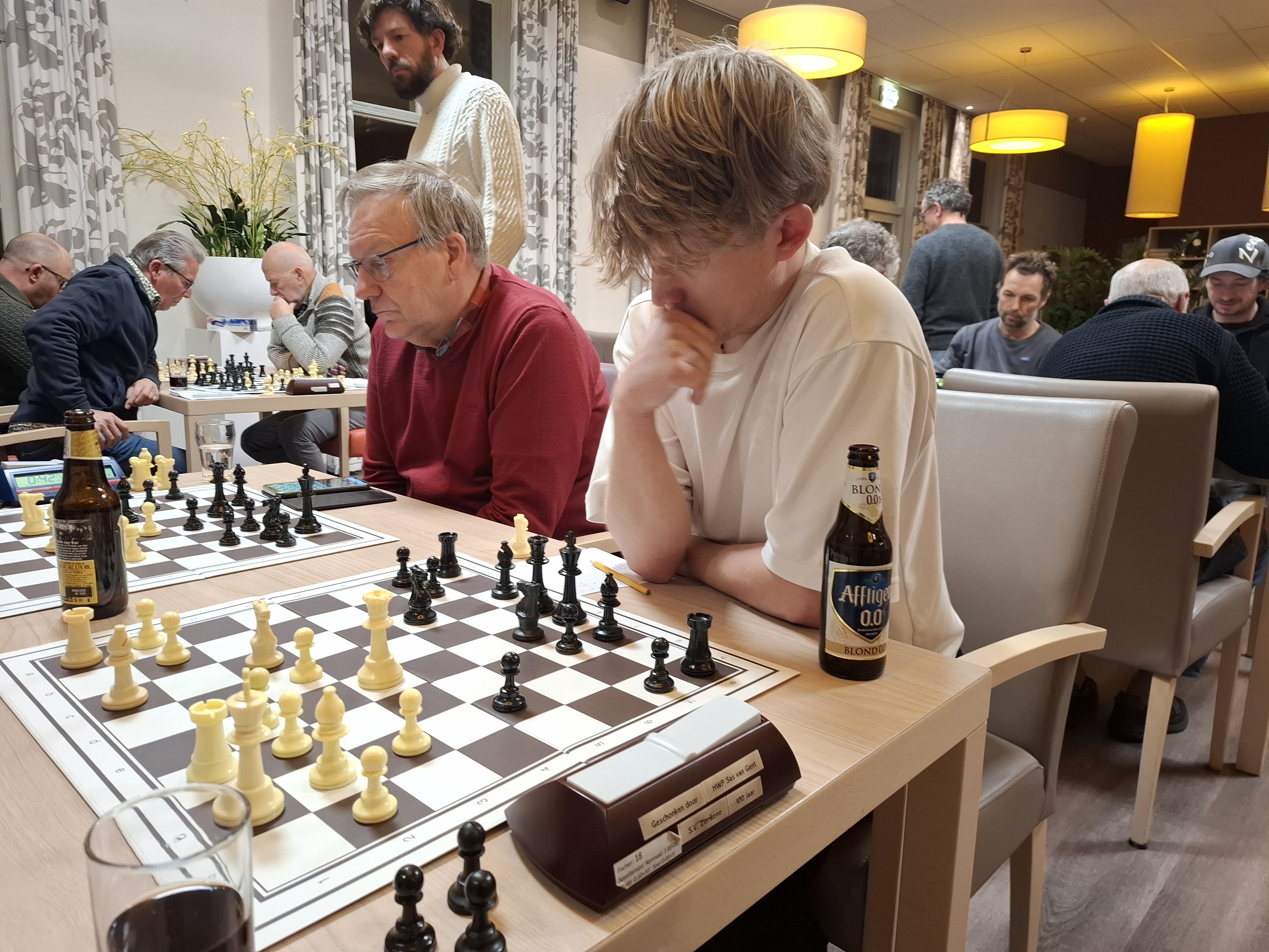 Nadat de dames werden geruild had Kersten echt duidelijk ruimte overwicht en moest wit proberen zijn lopers van de achterste rij zien te krijgen. Hierbij maakte Spiegels een rekenfout wat een pion kostte. Dit voordeel wist Kersten vakkundig uit te spelen en won de partij.
