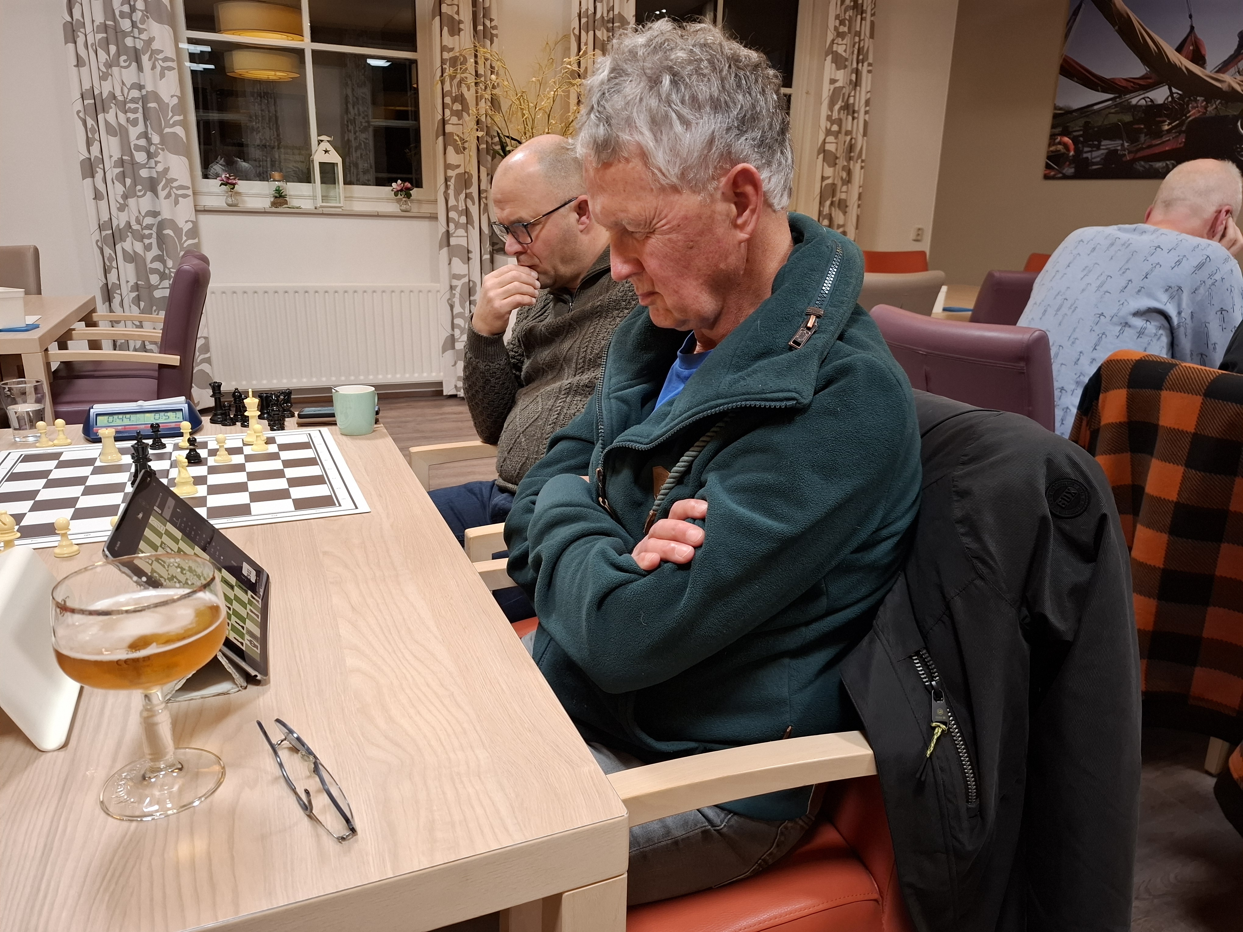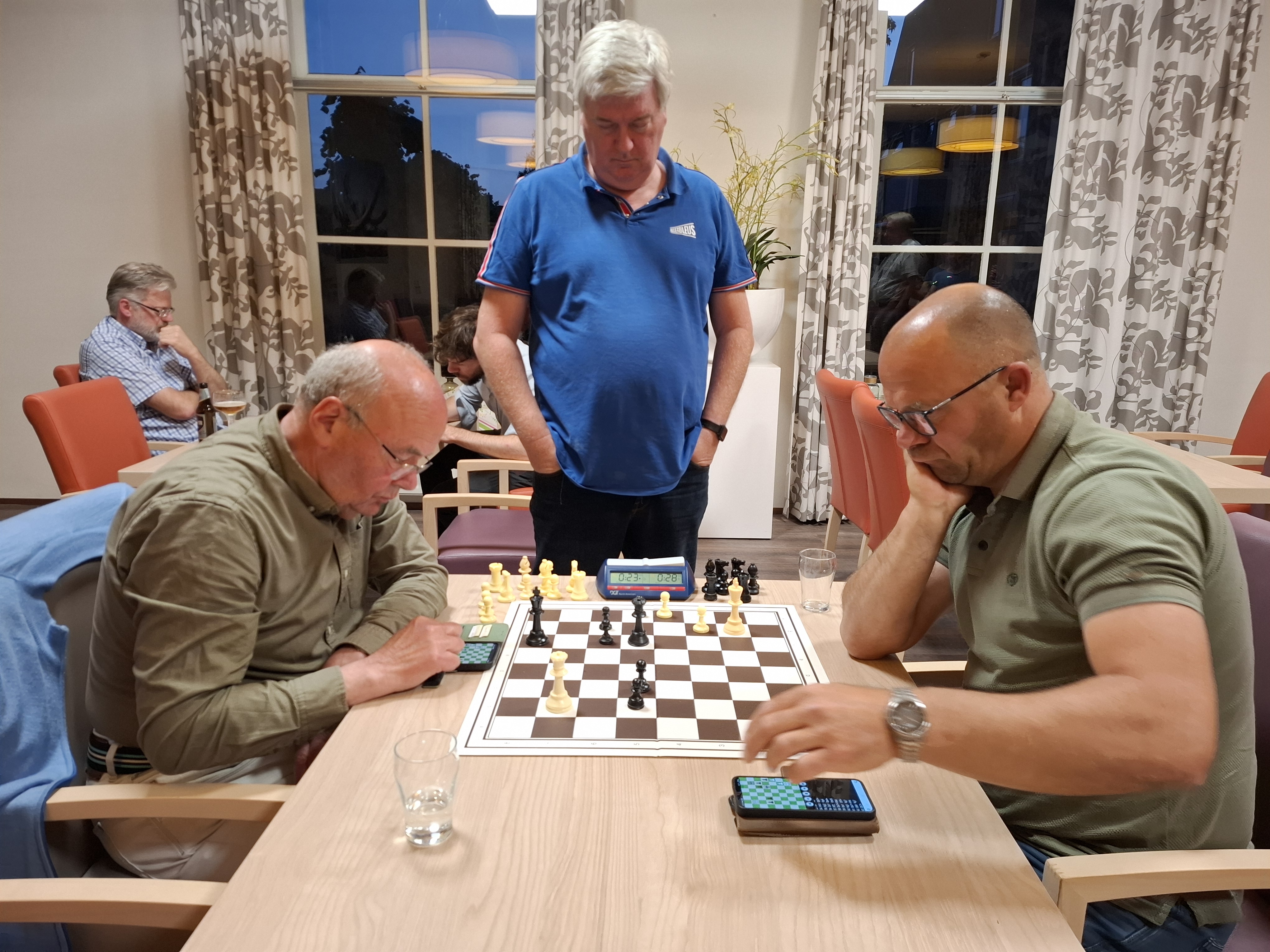 Den Boer speelde nog voor de vijfde plaats en De Vrieze (achtste) kon nog zakken. Was het goed? Nee verre van. Uitstekende zetten werden afgewisseld met onnauwkeurigheden en fouten, en dat zorgde ervoor dat het best vermakelijk was om naar te kijken. Met een interessante slagenwisseling vanaf zet acht won De Vrieze een pion en had hij een klein overwicht, maar mocht hij niet meer rokeren omdat zijn koning de slagenwisseling afsloot.