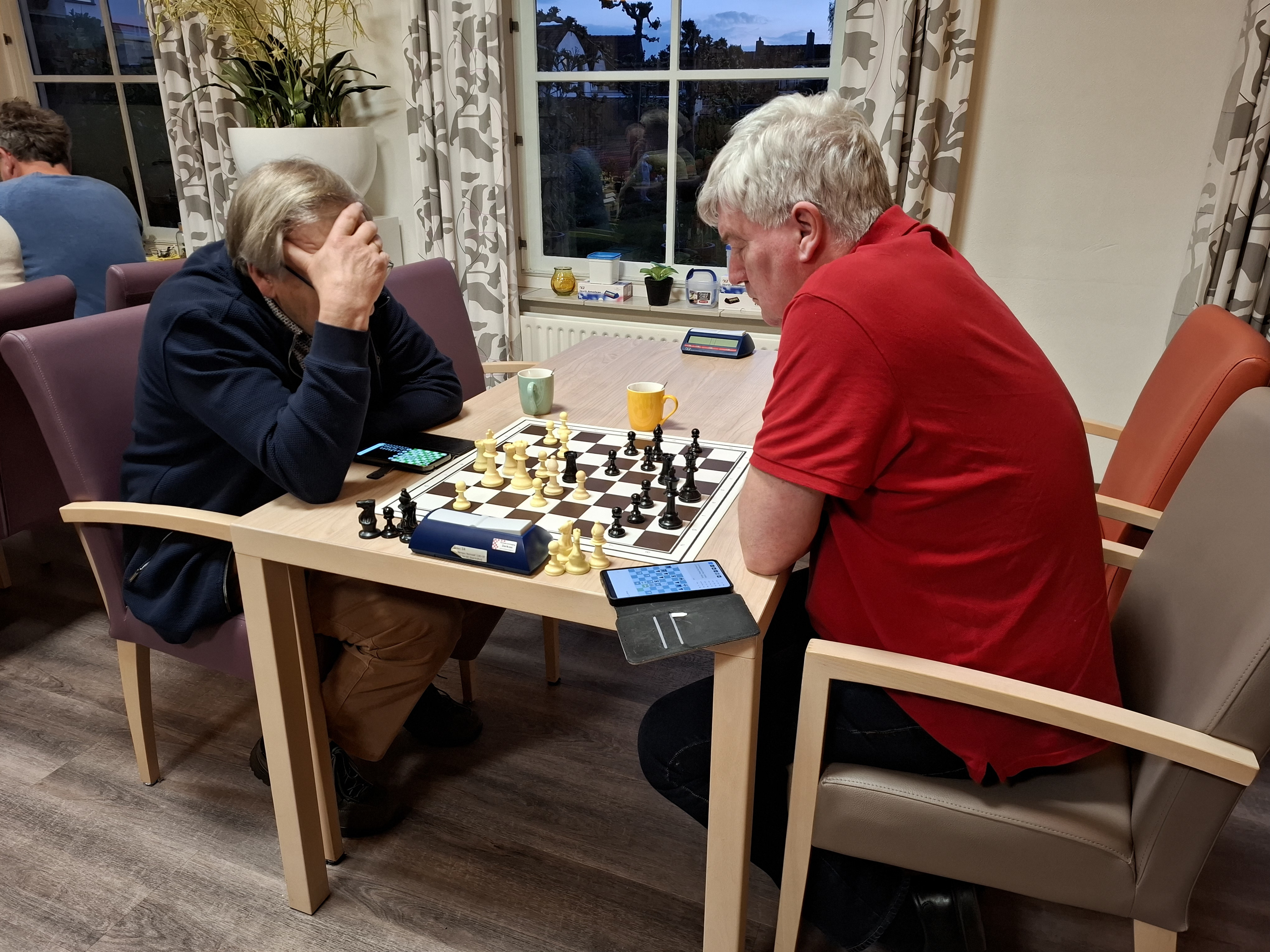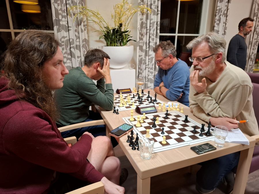 In speelronde zesentwintig van Schaakvereniging Zierikzee gooide Martin Both (linksachter) de titelstrijd weer helemaal open door te winnen van titelverdediger en lijstaanvoerder Aloys Kersten (rechtsachter). Daarmee komt de spanning terug in de top van de ranglijst, want zowel nummer twee Jeroen van Straten, als nummer drie Sjaak Spiegels (rechtsvoor) wisten hun partij te winnen van respectievelijk Martin Krijger en Floris van der Voorn (linksvoor) en daarmee in te lopen. Met nog drie ronden te gaan heeft Kersten nu een voorsprong van zesendertig punten op Van Straten en tweeënzestig op Spiegels. Een gewonnen partij in de top van de ranglijst is maximaal negenendertig punten waard. Both bleef op zijn beurt in het spoor van Spiegels, en heeft nog tweeëntwintig punten in te lopen voor een plekje op het podium.