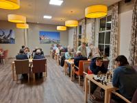Paul Greefhorst (links) was er juist even voor gaan staan, want hij moest eens grondig nadenken. Het bleek niet eens meer nodig, want plots pakte Fokko Baakman (rechts) te snel een pion vast. Het was al weer twee jaar geleden dat op deze manier een partij abrupt ten einde kwam. Want Baakman's dame zou namelijk van het bord verdwijnen. Het bleek overigens niet het enige bord waar soms te snel werd gespeeld.
